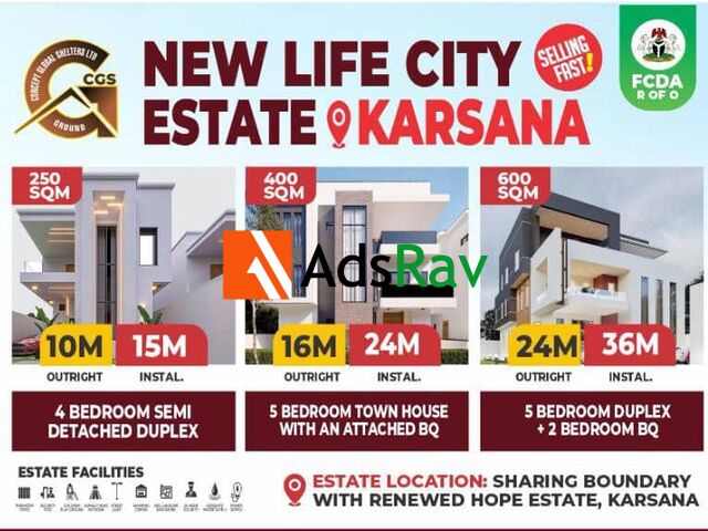 NEW LIFE CITY ESTATE – KARSANA Presented by Concept Global Shelters Ltd (CGS) Discover a modern lifestyle in the heart of Abuja!New Life City Estate, Karsana sits strategically beside Renewed Hope Estate, offering you a premium living environment designed for comfort, convenience, and class. Status: FCDA ROFO ApprovedDevelopment: Ground-breaking ongoing – Fast Selling!  Available Plot Sizes & Flexible Payment OptionsPlot Size    Outright Payment    Installment Payment250 SQM            ₦10,000,000    ₦15,000,000400 SQM      ₦16,000,000    ₦24,000,000600 SQM            ₦24,000,000    ₦36,000,000 Own a piece of Abuja today with payment plans tailored to your budg...