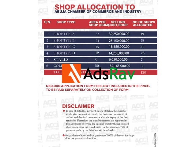 SHOP ALLOCATION NOW OPEN AT ABUJA CHAMBER OF COMMERCE AND INDUSTRY (ACCI) COMPLEX!  Take advantage of this exclusive investment opportunity to own a commercial space at the prestigious Abuja Chamber of Commerce and Industry (ACCI) location – a thriving hub for business visibility, foot traffic, and growth! AVAILABLE SHOP TYPES and PRICING: Shop Type    Size (sqm)    Cost/Shop (N)    No. of UnitsType A    32 sqm    N39,250,000    19 ShopsType B    24 sqm    N28,150,000    28 ShopsType C    15 sqm    N18,150,000    51 ShopsType D    12 sqm    N14,250,000    23 ShopsStalls    6 sqm    N6,050,000    7 StallsCold Room    50 sqm    N82,165,000    1 Unit  Application F...