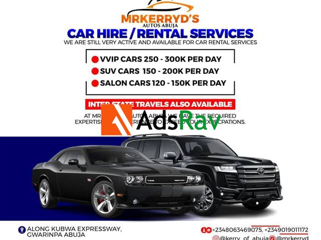 MRKERRYD’S AUTOS ABUJA – Premium Car Hire & Rental Services!  Looking for luxury, comfort, and reliability? We’ve got you covered with top-class rental options in Abuja!  VVIP Cars: N250K – N300K/day SUV Cars: N150K – N200K/day Salon Cars: N120K – N150K/day  Interstate Travels Also Available! Professionalism at its peak – expertise and experience you can trust.  Location: Along Kubwa Expressway, Gwarinpa, Abuja Contact: +2348063469075 | +2349019011172 IG: @kerry_of_abuja | @mrkerryd